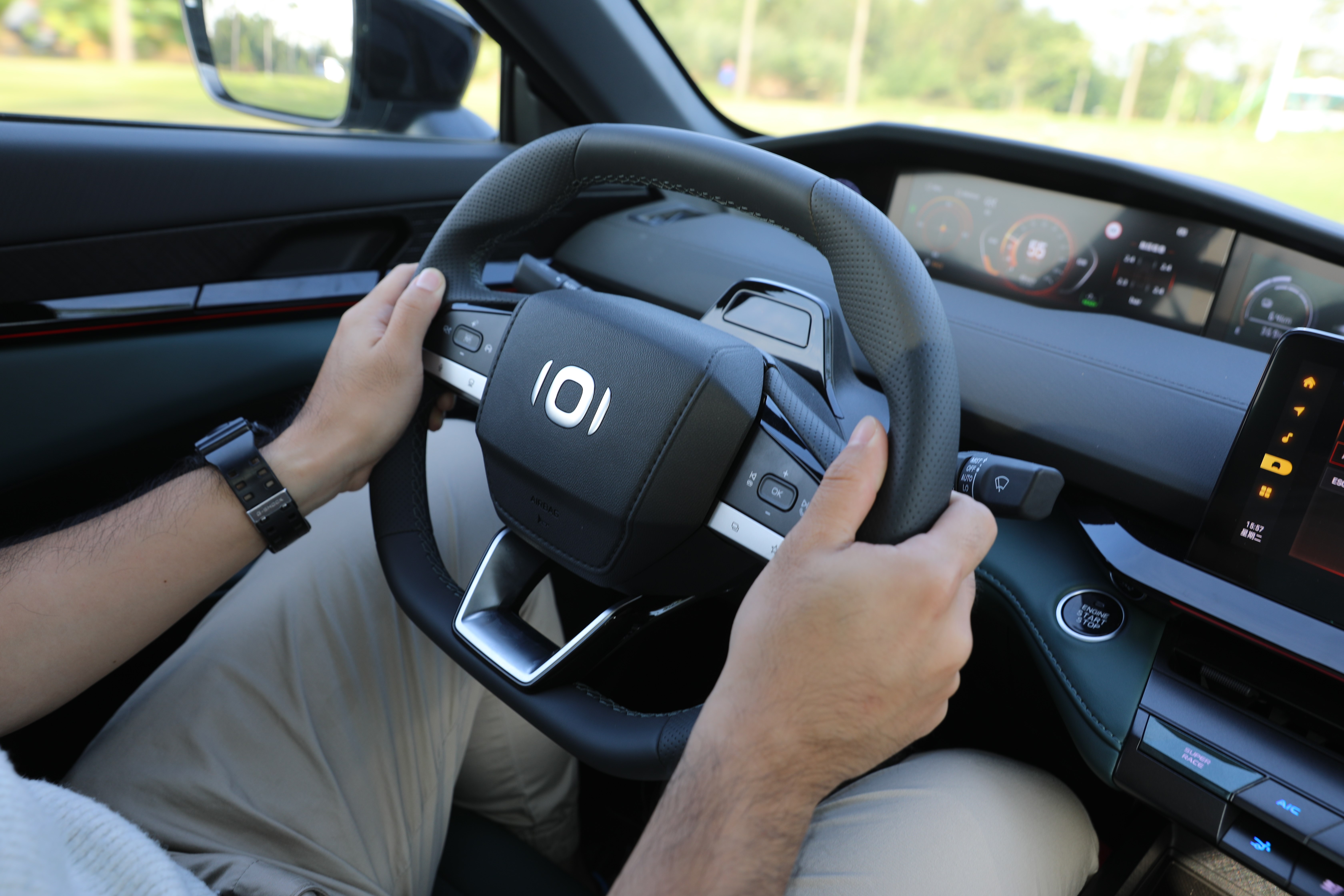 智能驅(qū)動模式能夠幫助車輛在不同電量狀態(tài)下,以最優(yōu)的驅(qū)動結(jié)構(gòu)對動力進行分配,而當(dāng)筆者啟動SUPER RACE模式,首先映入眼簾的是儀表盤、中控屏切換到更激進的界面UI,其次,車輛的動力進入到嚴陣以待的狀態(tài),油門響應(yīng)更為積極,配合模擬聲浪,整車的運動氣質(zhì)完全展現(xiàn)出來。