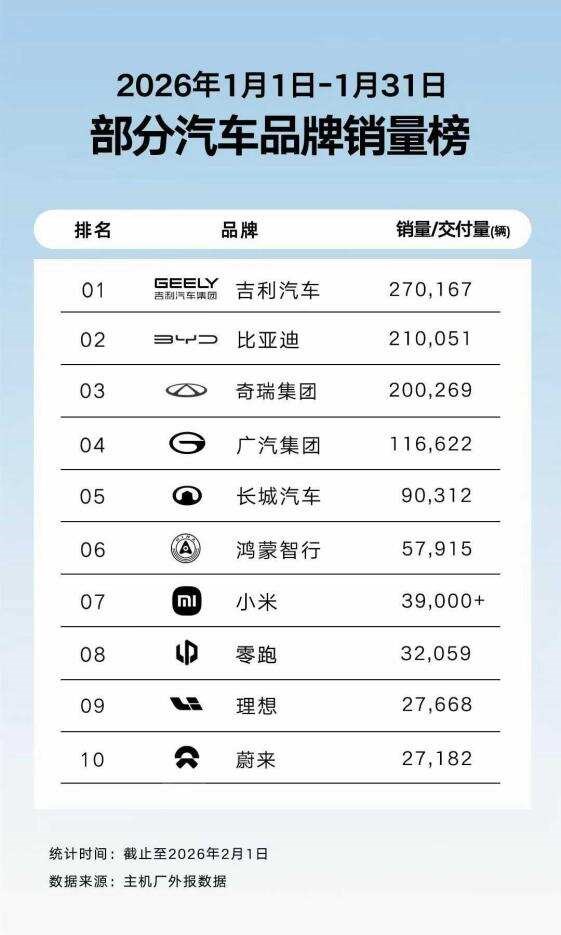 強(qiáng)勢銷量增長延續(xù)到了2026年。2月1日,吉利汽車(0175,HK)公告顯示,1月吉利汽車銷量突破27萬。這一表現(xiàn)不僅登頂中國汽車銷量榜首位,也助力了吉利控股成為1月銷量最高的中國品牌車企,真正實現(xiàn)“開門紅”。