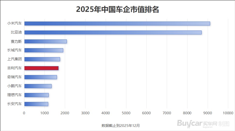 買車網(wǎng)Buycar統(tǒng)計顯示,即使已經(jīng)完成市值翻倍,2025年,吉利汽車銷量為比亞迪的89.3%,而市值估算不足比亞迪20%。即使在銷量排名前十位的全球汽車集團(tuán)中,吉利汽車銷量增速第一,而市值排名近乎墊底。